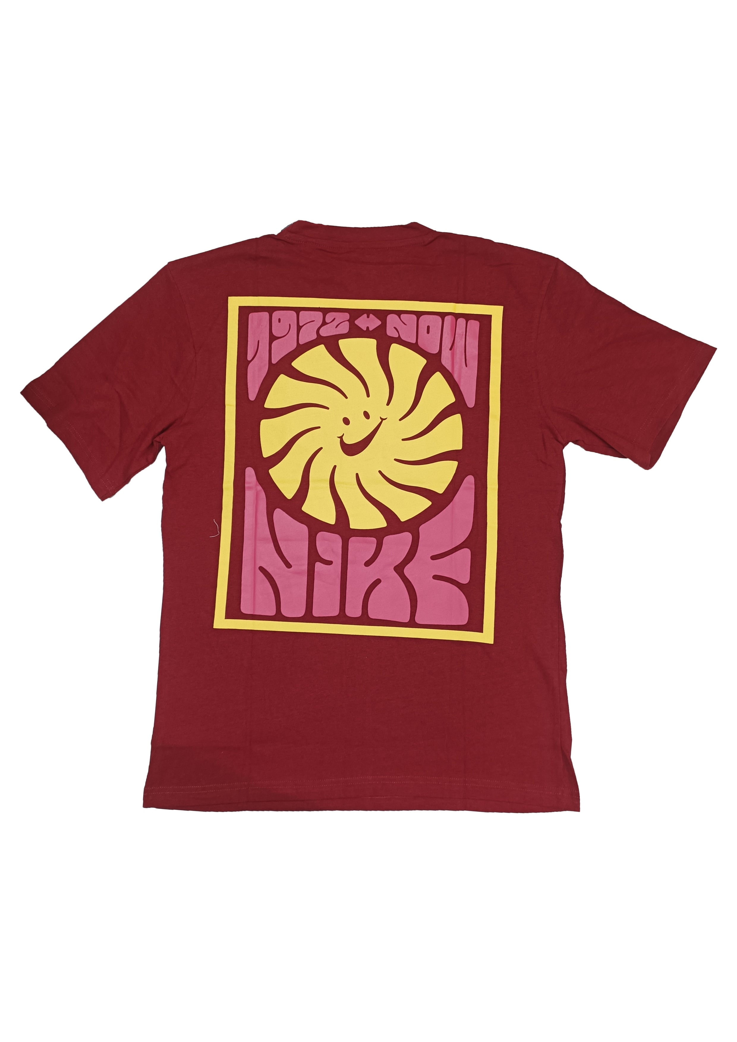 Spread positive vibes with this unique Nike "Have A Nike Day NOW" t-shirt. This stylish maroon tee features a retro-inspired graphic on the front left chest. The design incorporates the Nike swoosh within a vibrant, swirling yellow and pink pattern, complete with a smiling face at the center.