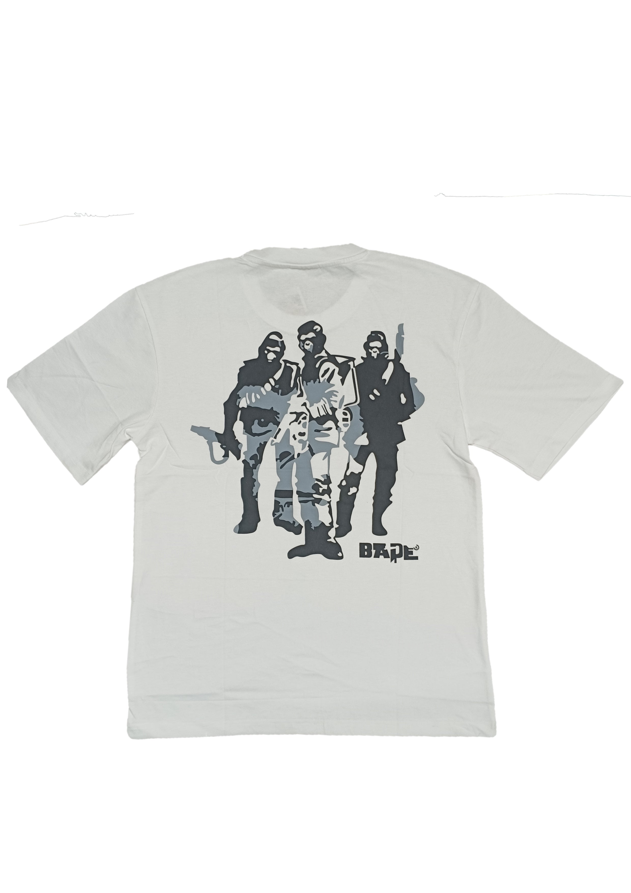 Showcase your streetwear style with this A Bathing Ape (BAPE) Army Relaxed Fit tee. This white t-shirt features a bold "BAPE" logo on the front, with a graphic underneath. The back of the shirt displays a striking graphic of three figures in military-style clothing, along with the "BAPE" logo. The relaxed fit provides a comfortable and stylish look. This shirt is a statement piece for any BAPE enthusiast.
