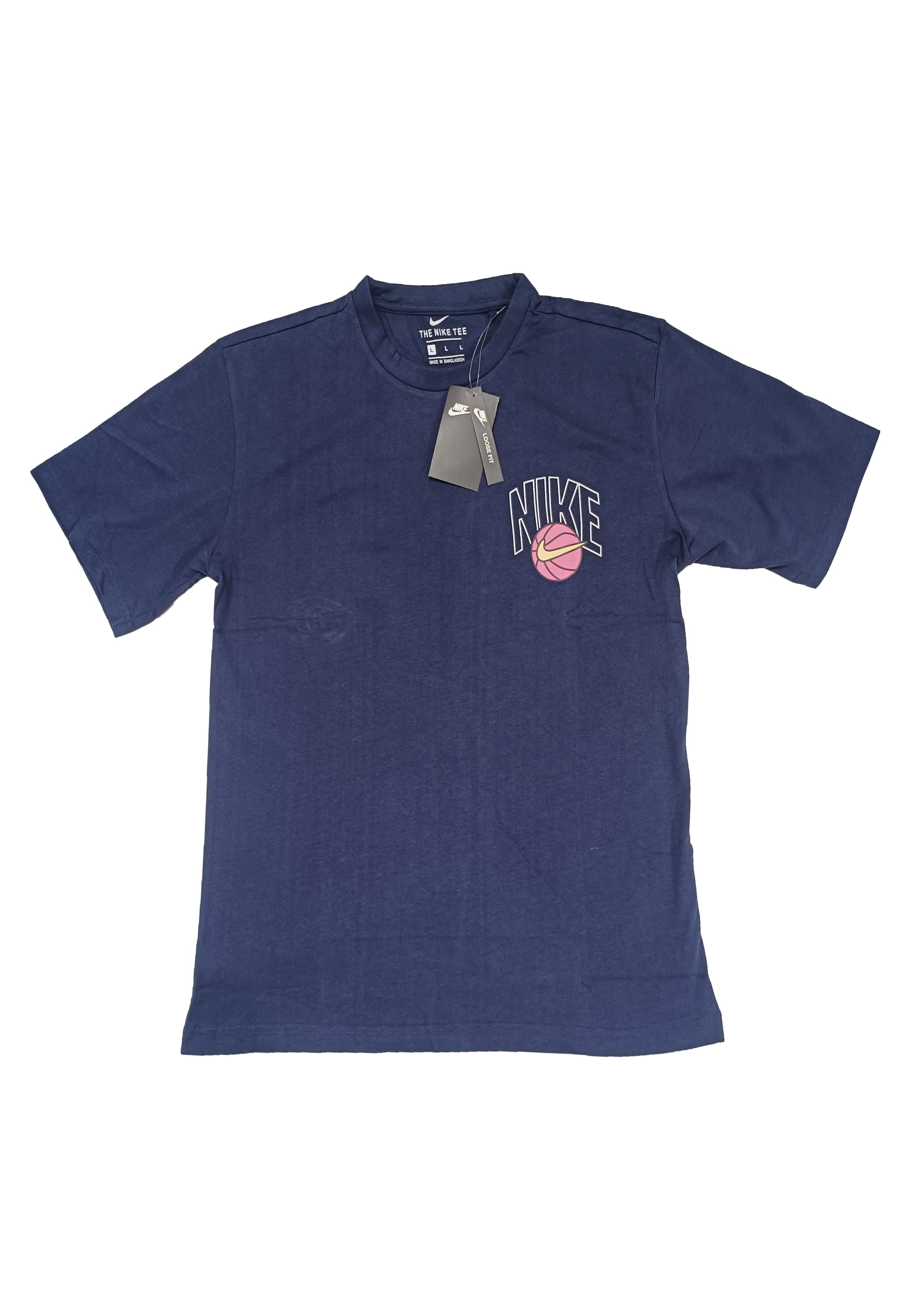 Score some serious style points with this unique Nike "Hoops & Rose" t-shirt. This brand new tee, complete with original tags, features a cool and contrasting design. The front showcases a smaller Nike logo in a stylized font, intertwined with a basketball rendered in pink and black outlines.